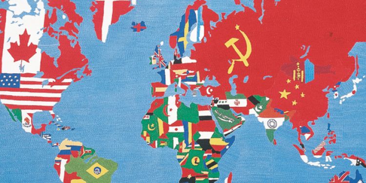 Il s’agit d'une carte de géographie sur lesquelles les territoires nationaux sont remplis par les motifs colorés de leurs drapeaux.