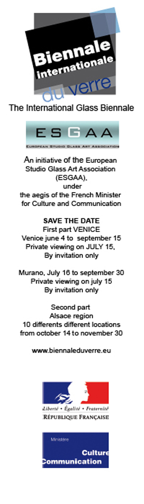 An initiative of the European Studio Glass Art Association (ESGAA), under the aegis of the French Minister for Culture and Communication, the International Glass Biennale showcasts the works of artists who use glass as a creative material alone or associated with other materials. The second part of the International Glass Biennale will take place inten different locations in the Alsace region, France, from October 14 to November 30, 2011.