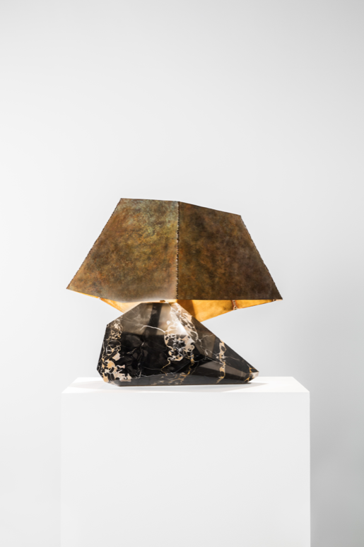 He creates the geometric lampshade out of copper, which contrasts with the organic yet angular shape of the marble. The marble represents natural beauty, whilst the copper which will eventually patina, represents how this beauty can fade.
