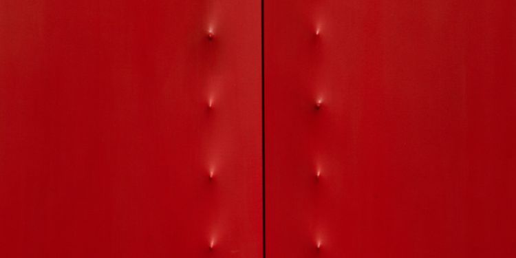 In Dittico Rosso from 1963, Enrico Castellani distances himself from the act of painting, trading it for embossed surfaces using nail structures. These disturbing elements empowered by the monochrome create a dynamic art piece made up of hollows and bumps playing with light and gaze.