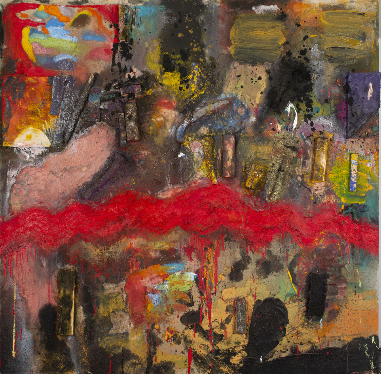 Image above: Jim Dine, Red Laughing, 2018, oil, acylic, sand and wooden objects on canvas, 244 x 244 cm