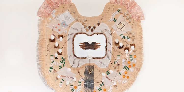 In the series of new works presented in Abidjan, Marie-Claire Messouma Manlanbien anchors herself in traditional artisanal weaving techniques, based on natural fibers such as silk and cotton kita cloth. Dyed and embroidered, her works carry a knowledge and a strength symbolized by the elements that compose them: shells, scales, drawings on paper.