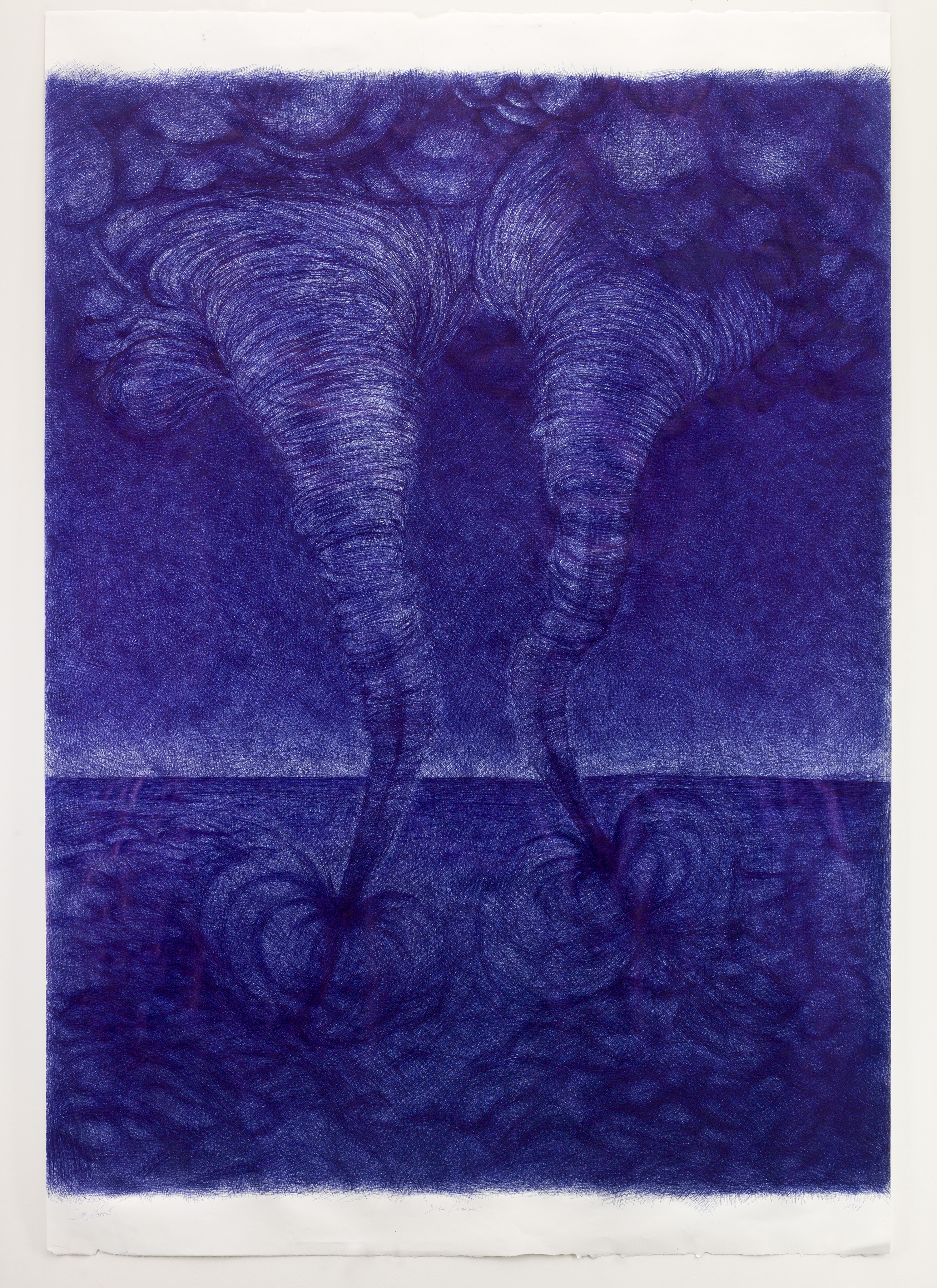 In 1988, at the age of 30, Fabre found himself in Berlin, spending sleepless nights obsessively drawing, colouring and rubbing out an entire cosmogony featuring tornados, cyclones, giant waves and storms. The highly distinctive metallic blue of his disposable pen form mesmerizing landscapes, their details so dense and intense they almost seem to tear the paper. Each drawing thus emerges as the peak of a one-man performance, a powerful act on the verge of hallucination and exhaustion.
