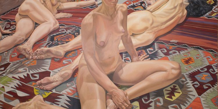 Over a dozen paintings, produced between 1969 and 2018, reveal a principled approach that has always been innovative despite the apparent simplicity of his subjects. As early as the 1960s, Philip Pearlstein defined a radical protocol that he still follows today, as part of his daily practice. He puts together strange scenes where his models, male or female, masked or undressed, pose for many hours over the course of many weeks. Compulsive bargain hunter and passionate collector, he immerses them in his skilfully crafted settings where he mixes mismatched furniture, patterned carpets, vintage toys, African sculptures, ethnic masks, gadgets, and more. He then meticulously paints his models with a neutral yet thorough touch, quashing any attempt to introduce a psychological aspect. The uncompromising and realistic result is free from any narrative interpretation and poses a disruptive question about the power of painting, perception, and the conventions of representation.
