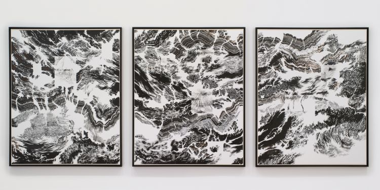 Through the recurring medium of black and white murals, chosen for their simplicity and graphic power, the artist has developed a language which causes viewers to doubt their perception of reality, immersing them in unstable and dynamic universes. From enveloping moving matter at the New York Drawing Center (2015-2016) to a cave animated by a furious circular vortex for the Sharjah Biennale (2017) and a fossilised Big Bang covering the floor of the Collège des Bernadins (2018), his somewhat metaphysical installations question our relationship with the intangible, the infinite, the invisible. Inspired by literature, astrophysics, philosophy and esotericism, his work redefines classical drawing by incorporating it into installations, sculptures and murals.