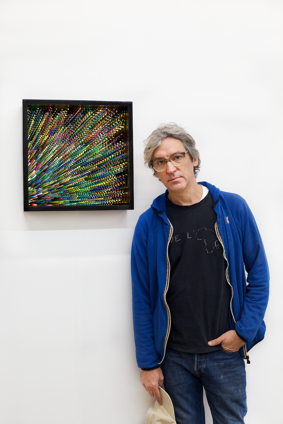 Repeating the same movement over and over, he engraves then paints thousands of splashes of vivid colour inside one-way mirrors, transforming the LED lights into explosions and celestial phenomena. This cathartic approach underscores the artist's examination of the modern human-machine pairing. He sets the object - an industrial-style mirror - against the arbitrary nature of the human hand, the singularity of human touch, the fragility of the human being.