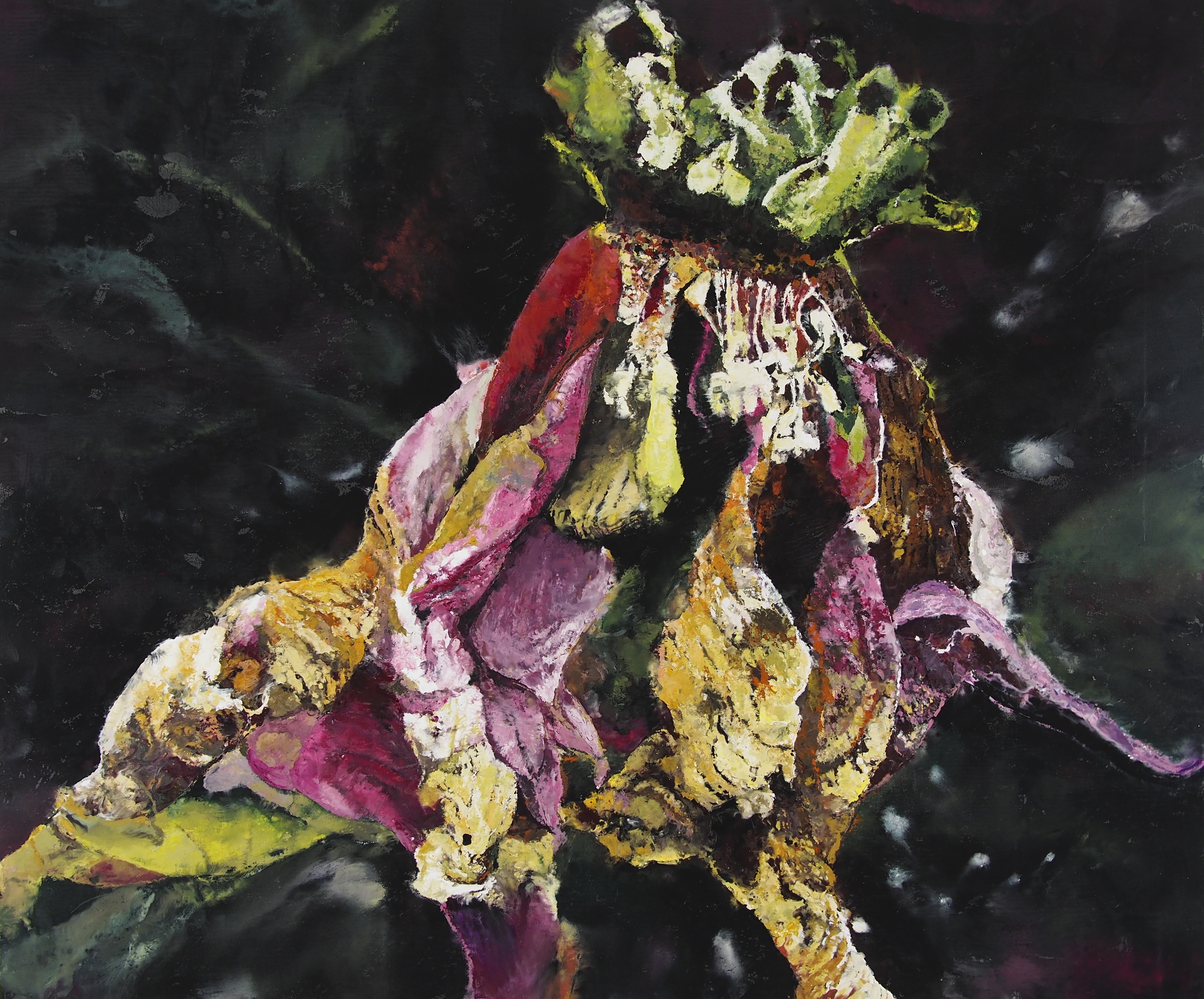 By embracing the theme of flowers, Philippa Cognée seems to have chosen another ordinary subject. However, his sunflower hearts, peonies and amaryllis, dried or wilted, are vastly enlarged and so deformed by the wax that they are hardly recognisable. The encaustic techniques has become more complex. Applied with a brush or slow-dripped, smoothed with an iron or artificially corrugated, wax presentsitself as a material split between two states, echoing the ephemeral in-between state of these flowers, between life and death.