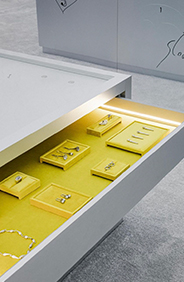 The exhibition space, itself inaugurated for this event, is entirely covered in mirrored metal panels arranged around a central fountain. This central island, designed as a memory archive, acts as a piece of furniture, concealing drawers and jewellery cabinets lined with vibrant yellow velvet.