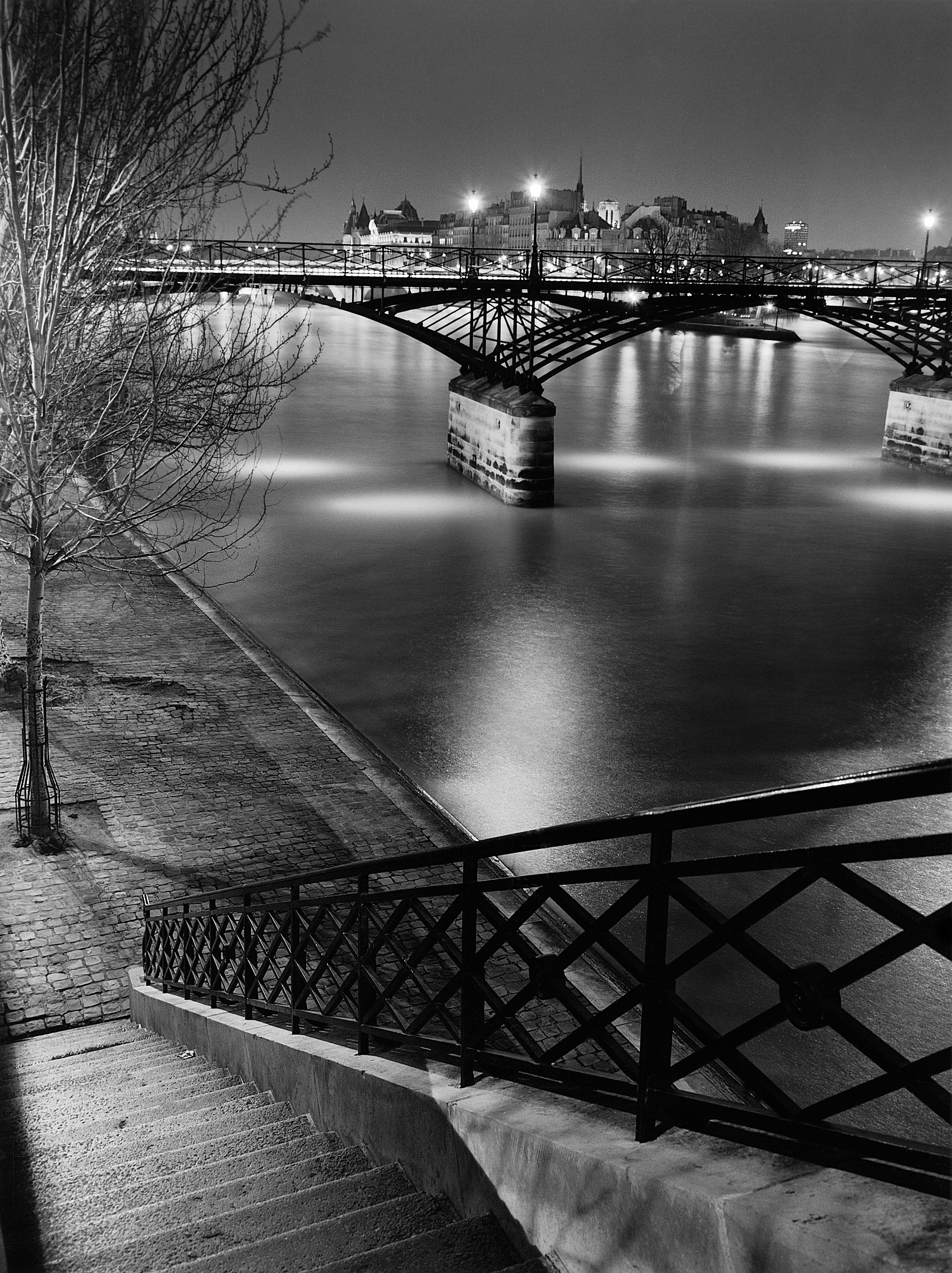 Pendant cinq ans, l’auteur-photographe américain Gary Zuercher est sorti la nuit équipé de son appareil photo pour capturer des images remarquablement évocatrices des ponts qui enjambent la Seine. Il a créé des photos en noir et blanc, riches en détails, claires et lumineuses. Les photos ont été prises sur pellicule et les tirages ont été réalisés à la gélatine argentique. Cette collection est unique et remarquable. L’utilisation du noir et blanc met en valeur une profusion de détails : les éléments architecturaux, les œuvres d’art, les bâtiments voisins, les arbres le long des berges et les lampes dessinant des traînées lumineuses sur l’eau. Cette présentation est un échantillon partiel des 85 photos des 35 ponts présentés dans son livre, Paris s’illumine : les Ponts de Paris la nuit. Également disponible en anglais sous le titre : The Glow of Paris : The Bridges of Paris at Night. Amour, mariages et marches funéraires ; révolution ; tout cela a eu lieu sur les ponts qui traversent la Seine à Paris. L’histoire de ces ponts débute avant la naissance du Christ. En 52 avant J.-C.Jules César conquit Paris. À la naissance de la ville, la population de Paris était concentrée sur l’île de la Cité. Les premiers ponts parisiens servaient à relier l’île aux rives droite et gauche de la Seine. À ce jour, huit ponts relient l’île de la Cité aux rives, et un neuvième mène à l’île Saint-Louis.