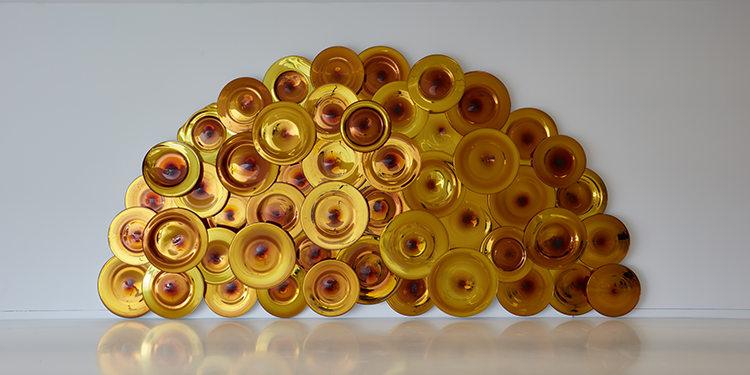 Pour sa deuxième intervention à l'Espace Commines, Jeremy Maxwell Wintrebert expose un ensemble majestueux constitué de 50 cives en verre soufflé miroitées, incarnant l’intensité de l’énergie solaire. Véritable hommage à la lumière, cette constellation ardente de près de 7 mètres sur 4 symbolise le magma primaire des origines de la création. Cette œuvre sera accompagnée d’une sculpture lumineuse réalisée par Félicie d’Estienne d’Orves. Symboliquement placées en regard l’une de l’autre, Matter Sunrise Terminal G12 et Soleil (~ 8 min) interrogent notre relation intime à l’espace cosmique et résonnent intensément de manière à instaurer une atmosphère puissante et énigmatique.