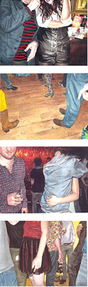 La série d’aquarelles « Fêtes » donne à voir des scènes de soirées festives, véritables tableaux de genre qui témoignent d’une réalité contemporaine propre à la génération de l’artiste.