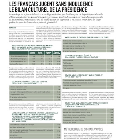 Le sondage Viavoice-Communic’Art, sur le bilan culturel de la présidence d’Emmanuel Macron dont Le Journal des Arts publie et analyse les résultats dans son numéro 567 du 14 mai 2021, dresse un portrait en demi-teinte de l’opinion des Français sur la politique culturelle du président Emmanuel Macron quatre ans après son élection.