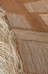 En face des monotypes se trouve une série de panneaux tissés suspendus en raphia ; le palmier raphia est originaire de l'île de Madagascar. Ici encore, la fondation structurelle est stratifiée et linéaire, et les panneaux cousus sont suspendus, permettant au spectateur d'interagir avec l'avant et l'arrière. Un côté offre une structure linéaire clairement définie ; l'autre révèle le geste et la méthode qui nous y conduisent, invitant le spectateur à entrer dans l'acte créatif. Inspirées à la fois par Madagascar et le Maroc, ces œuvres transcendent l'interprétation de l'artiste de la pratique et de la tradition locales, pour révéler le processus de création lui-même.