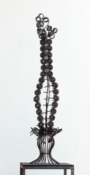 Marius Dansou sculpte des coiffures fantaisistes à partir de fer à béton. Ce matériau pourtant rigide et dense, utilisé pour les fondations d’un bâtiment, devient aussi souple qu’un cheveu dans les mains de l’artiste. Bercé par les Ayônounda (tresses en langue Fongbé), l’aspect torsadé du fer à béton lui rappelle les nattes des femmes qui l’entourent. Impressionné par l’agilité des tresseuses, il s’approprie leurs mouvements et leurs techniques pour imaginer de nouvelles coiffures.