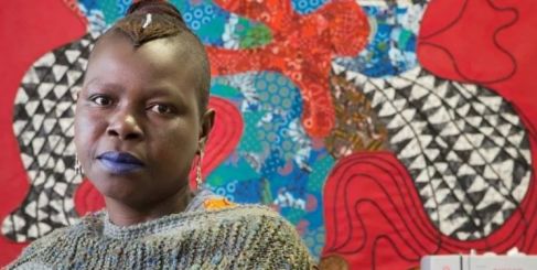 Today, her monumental textile works on canvas combine painting, sewing, and fabric collage, incorporating printed textiles such as tshwe-tshwe and other traditional African patterns. Her approach blends abstraction with spiritual expression, making her art a therapeutic tool and a message of hope and healing. “My work is guided and inspired by water, femininity, and a mix of joy and sadness,” says the artist.