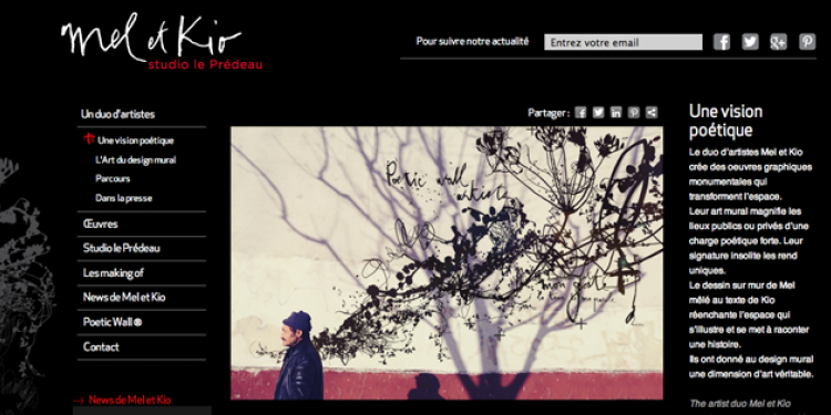 Le duo d'artistes Mel et Kio vient tout juste d'ouvrir son nouveau site Internet, www.meletkio.com. Créé par Communic'Art, ce site inclut de nombreux visuels d'oeuvre ainsi qu'une librairie de vidéos "making off" des installations du duo d'artistes et un blog.