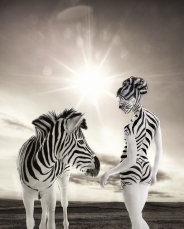 L’humain doit se faire accepter par l’animal, lui ressembler et s’abandonner à lui. Les corps des hommes et des femmes peints aux couleurs et aux motifs des peaux, pelages, écailles, imitent la grâce et l’élégance des fauves.