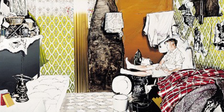 Prenant pour point de départ des photographies d’archives de la première guerre mondiale, il compose des pièces ambiguës où objets et meubles hétéroclites s’accumulent.